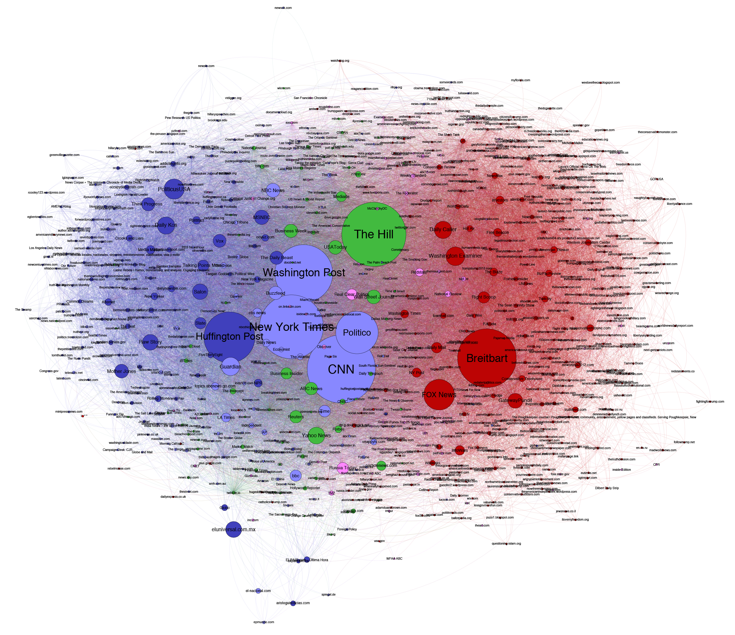 El gráfico de arriba muestra qué fuentes de noticias son más citadas por las cuentas de Twitter en el mapa del panorama político de EE. UU. que se muestra en la parte superior. Las fuentes periodísticas tradicionales dominantes son citadas principalmente por la izquierda, mientras que la derecha se sirve de las fuentes como Fox, Breitbart y True Pundit.