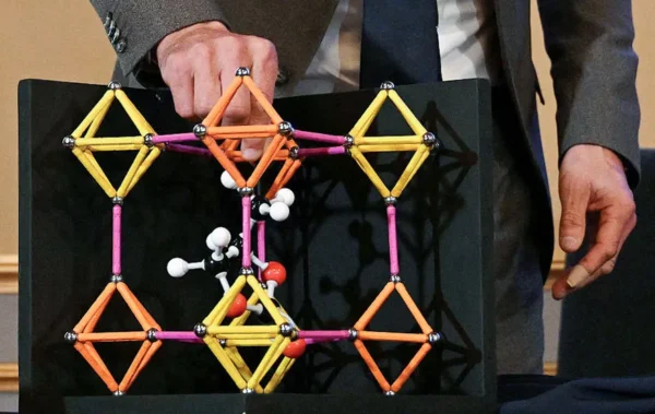 Heiner Linke, presidente del Comité Nobel de Química, utiliza un modelo para explicar cómo las estructuras metalorgánicas (MOF) pueden atrapar moléculas más pequeñas en su interior. En octubre de 2025, Yaghi y otros dos científicos ganaron el Premio Nobel de Química por identificar las MOF.