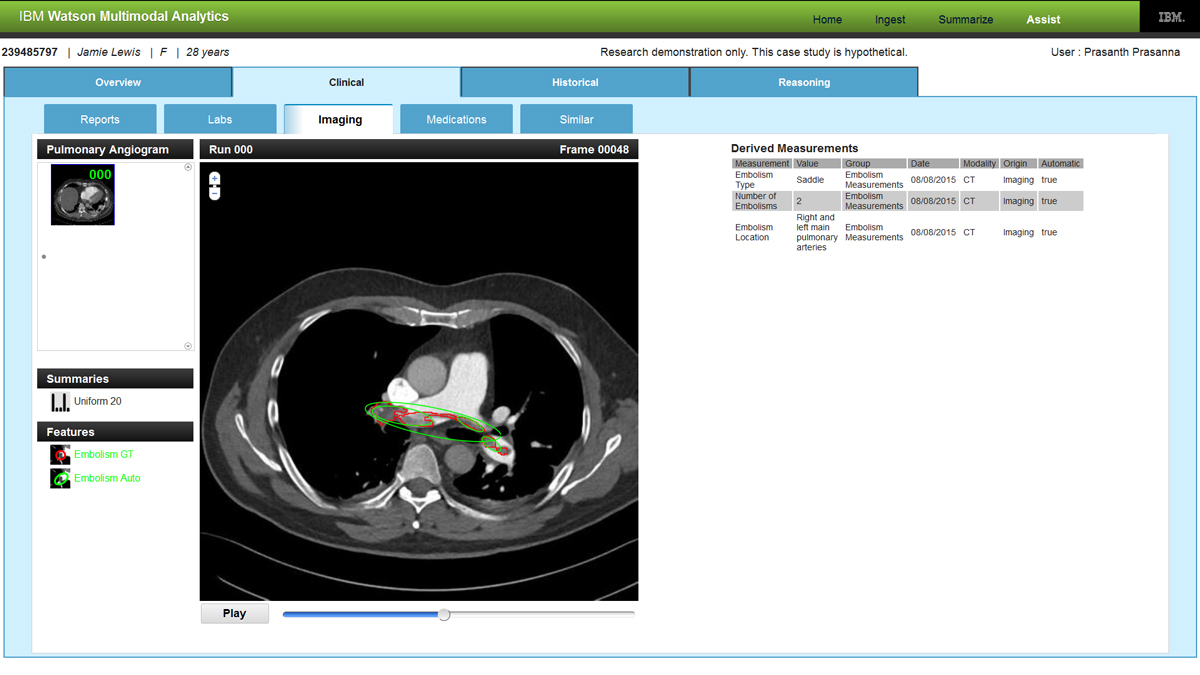 En una demostración del sistema, Syeda-Mahmood utilizó Avicenna para examinar el caso de una mujer de 28 años que se quejaba de dificultad respiratoria. El historial médico de la paciente incluía imágenes de angiograma pulmonar de los vasos sanguíneos que rodean los pulmones, algunos análisis de sangre y un texto que comentaba que su madre había sufrido varios abortos espontáneos.