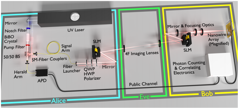 Ahora, el equipo de Lum ha desarrollado un transmisor y un receptor que aprovechan este mecanismo. Su dispositivo está formado por una pistola de fotones que dispara fotones individuales a través de una especie de máscara llamada un modulador de luz espacial que sobrepone informaciones sobre la frente de onda del fotón. Si este modulador está formado por un conjunto de 8×8, podrá codificar 64 bits de información. Al mismo tiempo, el modulador de luz espacial añade una señal aleatoria a las informaciones transmitidas.