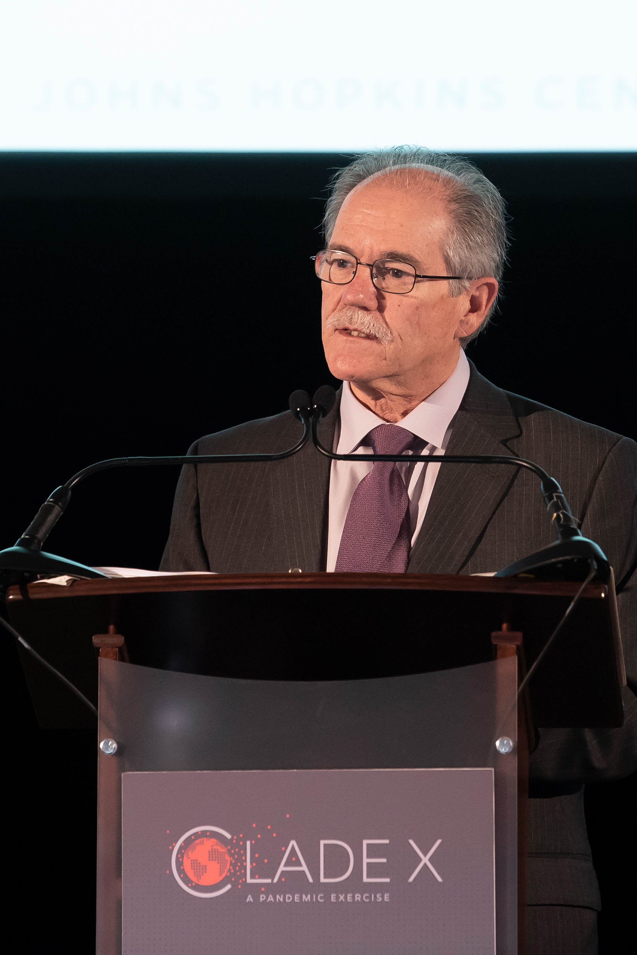 Pero las cosas han cambiado mucho desde 2001. Así que el pasado 15 de mayo, algunos de los participantes de Dark Winter empezaron a trabajar en un nuevo ejercicio. La nueva versión del experimento, bautizada como CladeX (CladoX), se llevó a cabo en un lujoso hotel en Washington (EE. UU.). A las 9 a.m., el salón de baile se inundó con música de suspense y las luces se atenuaron alrededor de una mesa en forma de U donde un gabinete ficticio había tomado asiento. Entre los actores estaban el exlíder del Senado Tom Daschle (retomando ese papel), la antigua jefa de los Centros para el Control y la Prevención de Enfermedades (CDC, por sus siglas en inglés) Julie Gerberding y a la creadora de Dark Winter, Tara O’Toole.